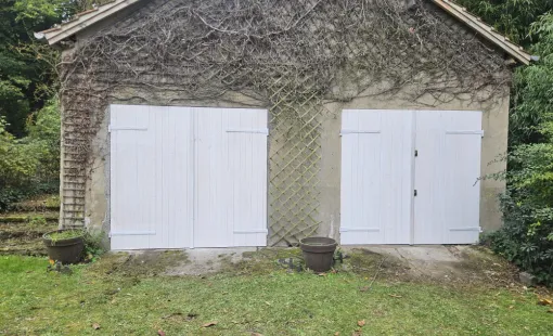 Houelle menuiserie a procédé à la fabrication en atelier de deux portes de garage en bois sur mesure.
